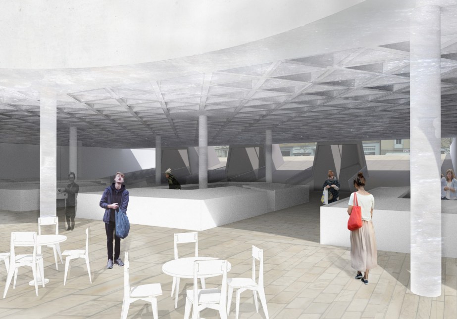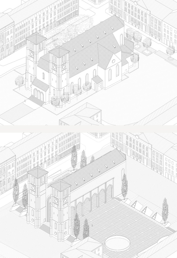 Mirabellplatz is close to an important breach in Salzburg’s ancient walls. It contains the three pillars of the European city: palace, church and market. In the transition to a more secular society, however, the aesthetic value of the religious building becomes a key factor in the debate over public space, while the likely decline in the number of practicing believers will probably reduce the Andräkirche to an empty container. All the same, the bell towers, reconstructed after World War II, are a landmark in the city and bear witness to the symbolic important of this presence in the urban fabric. Hence, the project envisages reducing the building to its most significant architectural elements: the nave, apse and bell towers. The axiality of the religious building is questioned in favour of a less hierarchical reading of the space, as happened with the civil basilicas of antiquity. A square raised to it floor level is set perpendicular to its nave and becomes the ideal continuation of the basilica, reminiscent of the unfinished extension of Siena cathedral. The new square hosts the traditional weekly market and lend itself to becoming a setting for various events in city’s life. This operation involves rising a significant part of the underground car park. The space thus transformed becomes a second square, designed to accomodate a new fixed market, whose logistics are guaranteed by the integration with the car park. This covered space, which can be used all the year round, is accessible through a large ramp open towards the residential fabric and weaves together with the “basilica” generating a new urban topography.